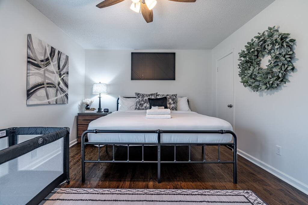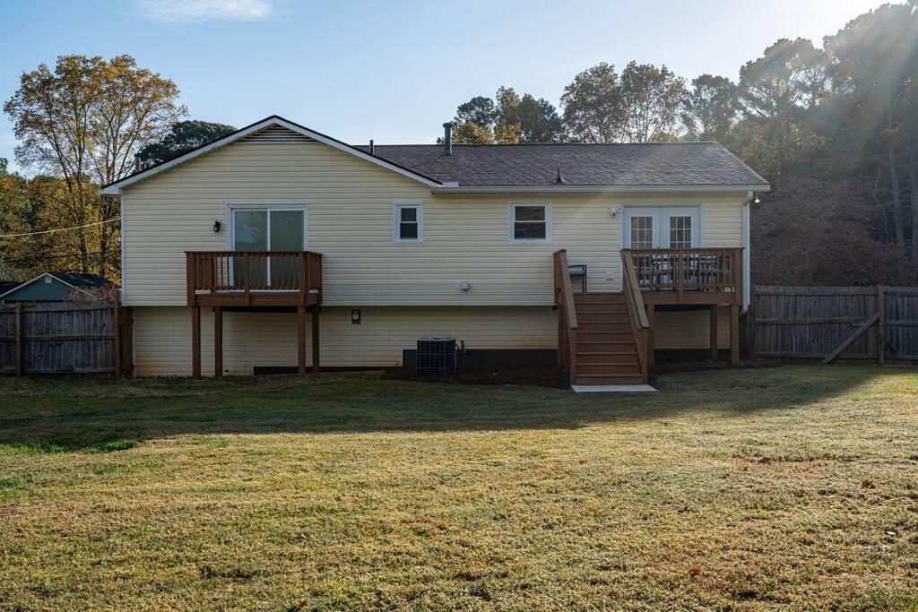**Welcome to The Allatoona Ranch! This home is a new listing and is hosted by experienced Super Hosts!** Why You’ll Love This Home: ✔ Spacious & Comfortable: 3 bedrooms, 2 full baths, plus a sofa bed for extra guests. ✔ Entertainment Space: Enjoy a pool table downstairs for game nights. ✔ Fully Equipped Kitchen: Stocked with cookware, utensils, and appliances for home-cooked meals. ✔ Dedicated Workspace: Ideal for remote work with a desk and chair. ✔ Smart TVs in Every Room: Stay entertained with streaming access. ✔ Private Backyard & Decks: Two spacious decks overlook the large, fully fenced-in backyard. ✔ Laundry On-Site: Washer & dryer available for guest use. ✔ Pet-Friendly: Bring your furry friends along (pet fee applies). ✔ Prime Location: Minutes from Lake Allatoona, Downtown Woodstock, and major highways. ✔ Fast WiFi & Streaming Services: Stay connected and entertained throughout your stay. Sleeping Arrangements: 🛏 Bedroom 1 (Primary Suite): King bed, Smart TV, en-suite bath, pack ‘n play available. Bedroom 2: Queen bed, Smart TV. 🛏 Bedroom 3: Queen bed, Smart TV. 🛋 Living Room: Sofa bed for additional sleeping space. Prime Location – Explore Woodstock & Beyond! 🚤 Lake Allatoona (2.2 miles, 5 min) – Boating, fishing, and water activities at Kellogg Creek Boat Ramp & Payne Campground. 🏙 Downtown Woodstock (4.9 miles, 10 min) – Boutique shopping, craft breweries, live music, and great dining options. ⚾ East Cobb Baseball Complex (8.3 miles, 15 min) – Popular sports facility for tournaments and events. 🎢 Six Flags White Water (14 miles, 25 min) – Fun-filled water park for all ages. 🏟 Truist Park (Atlanta Braves Stadium) (19.4 miles, 30 min) – Catch a Braves game or explore The Battery. 🎭 Atlanta Attractions (30.8 miles, 40 min) – Visit Mercedes-Benz Stadium, Georgia Aquarium, World of Coca-Cola, & Fox Theatre. Book Your Stay Today! Whether you're visiting for a weekend getaway, a family vacation, or a business trip, The Allatoona Ranch offers a perfect blend of comfort, relaxation, and adventure. Secure your dates today and experience Woodstock, GA like never before! ✨ Extended Stay Cleaning Notice ✨ To maintain a consistently clean and comfortable environment, a $200 mid-stay cleaning fee applies to reservations longer than 7 nights. This service includes fresh linens, restocked essentials, and a full reset to keep your space in top shape for the rest of your stay. Details will be confirmed after booking based on length of stay and number of guests.