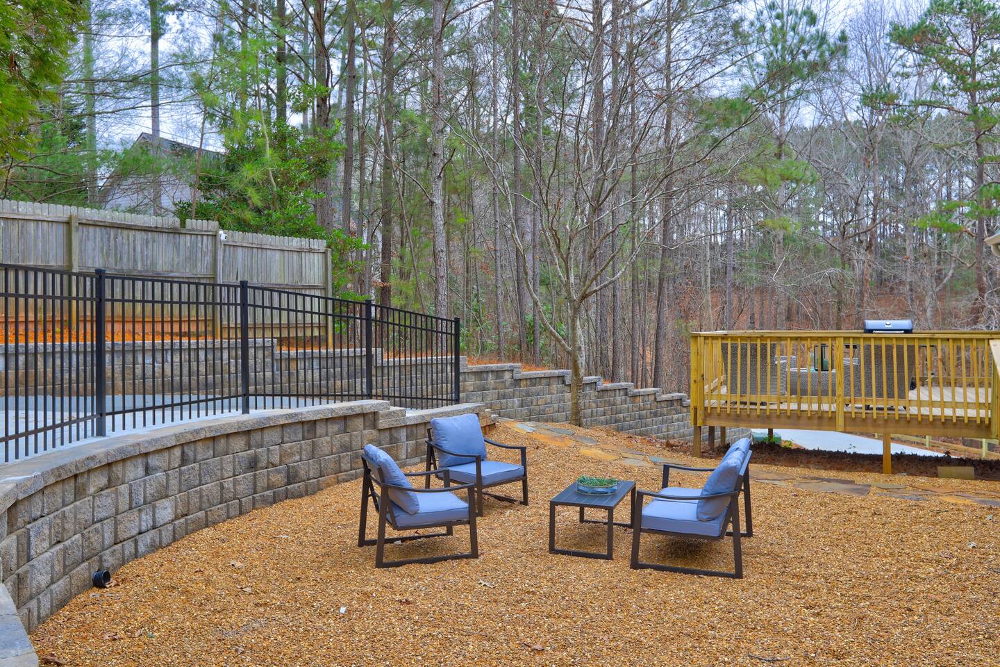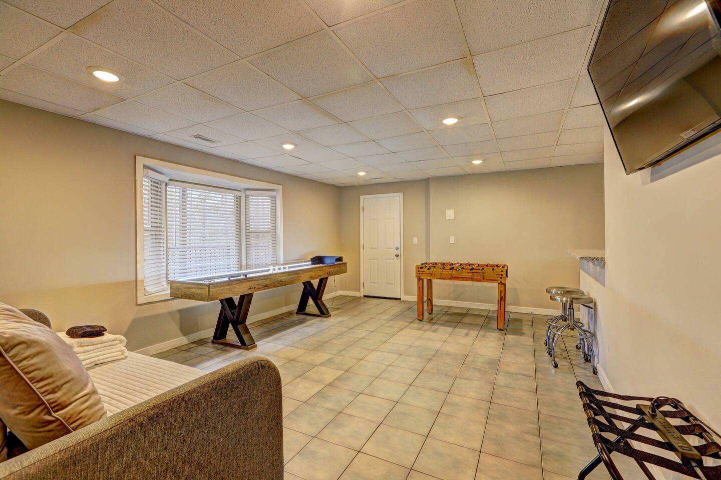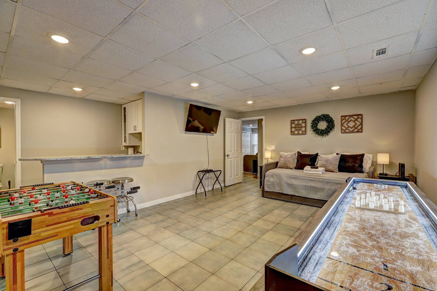 Welcome to The Hideaway! This home is a new listing and is hosted by experienced Super Hosts. Why You’ll Love This Home: ✔ Expansive Space: Accommodates up to 16 guests with multiple sleeping options. ✔ Game Room & Entertainment: Includes foosball, shuffleboard, Smart TVs, and a wet bar. ✔ Fully Equipped Kitchen: Stocked with all essentials, including a high chair for little ones. ✔ Private Deck & Outdoor Living: Rocking chair front porch, back deck with a grill, and a fenced backyard.✔ Smart TVs in Every Room: Stay entertained with streaming access. ✔ Laundry & WiFi Included: Washer, dryer, and high-speed WiFi for convenience. ✔ Pet-Friendly: Bring your furry friends (pet approval & fee required). ✔ Dedicated Workspaces: Ideal for remote workers or business travelers. ✔ Keyless Entry: Secure and seamless self-check-in experience. ✔ Prime Location: Close to Lake Allatoona, Downtown Woodstock, and Atlanta attractions. Sleeping Arrangements: 🛏 Bedroom 1 (Primary Suite): King bed, crib, Smart TV, en-suite bathroom. 🛏 Bedroom 2: 3 queen beds, Smart TV. 🛏 Bedroom 3: 2 queen beds, Smart TV. 🛋 Living Room: 2 pull-out sofa beds. Prime Location – Explore Woodstock & Beyond! 🚤 Victoria Harbour Marina (4 miles, 10 min) – Perfect for boating & lake adventures. 🏙 Downtown Woodstock (5 miles, 12 min) – Restaurants, boutique shopping, and live music. ⛰ Kennesaw Mountain National Battlefield Park (12 miles, 20 min) – Ideal for hiking and historic exploration. ⚾ Truist Park (Atlanta Braves Stadium) (20 miles, 30 min) – Watch a game or explore The Battery. 🎭 Mercedes-Benz Stadium & Downtown Atlanta (31 miles, 40 min) – Home to United FC, Falcons, Georgia Aquarium, & Fox Theatre. Book Your Stay Today! Whether you're in town for a large family gathering, work trip, or weekend getaway, The Hideaway is the perfect blend of modern comfort, outdoor relaxation, and easy access to Woodstock’s top attractions. Secure your dates now and experience the best of North Georgia!